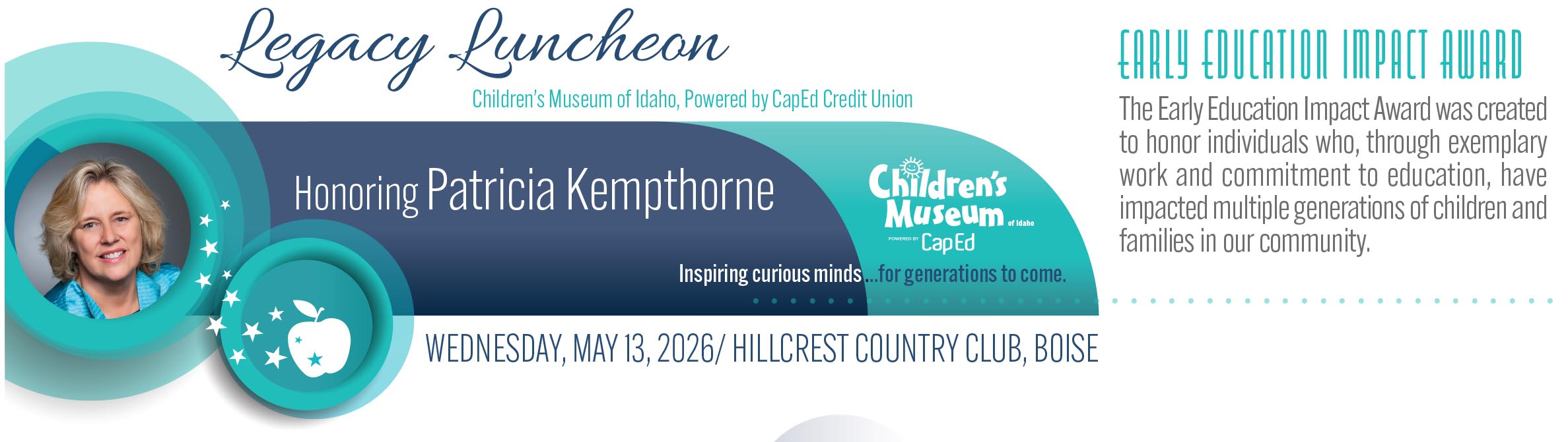On May 13, 2026, the Children's Museum of Idaho will be honoring Former First Lady Patricia Kempthorne with the Early Education Impact Award at the Hillcrest Country Club in Boise, Idaho.