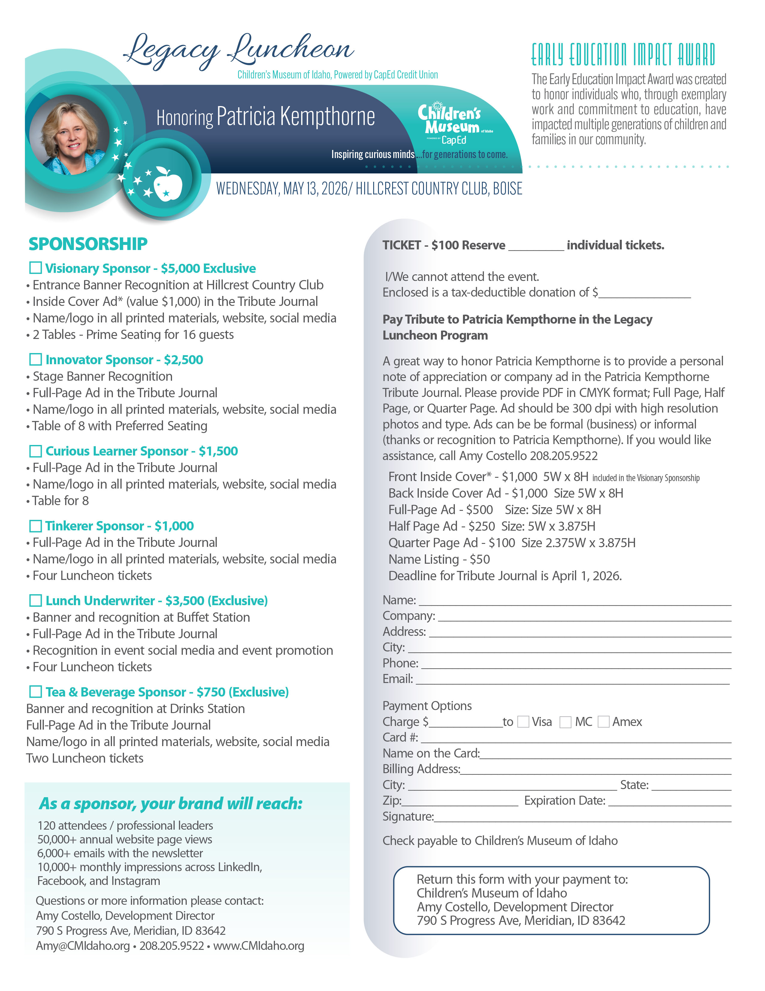 To reserve your ticket, sponsor a table, or provide a tribute ad, please reach out to Amy Costello at (208) 205-9522 or Amy@CMIdaho.org.
